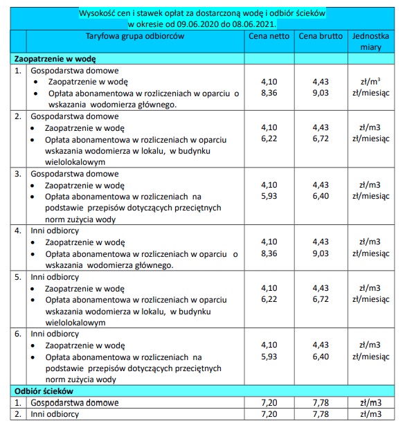 Prezentujemy wyciąg z decyzji Państwowego Gospodarstwo Wodnego Wody Polskie z taryfą opłat obowiązujących od 9 czerwca 2020 roku do 8 czerwca 2021.